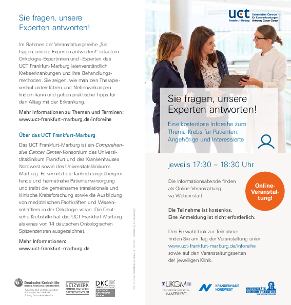 Online-Informationsreihe 2021: Sie fragen, unsere Experten antworten! Herzlich willkommen zu unserer Online-Informationsreihe zum Thema Krebs für Patienten, Angehörige und Interessierte!