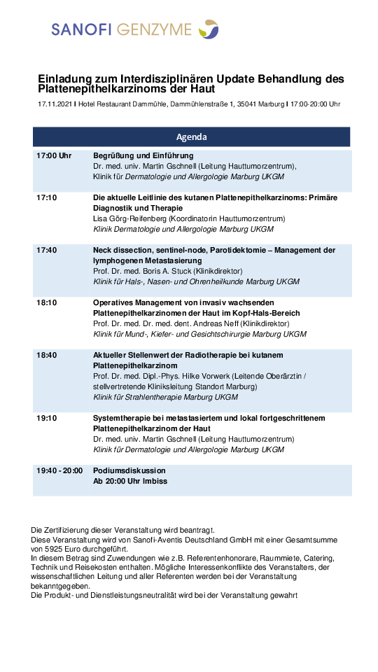 17.11.2021 Fortbildungsveranstaltung für Ärzte: „Interdisziplinäres Update“ Behandlung des Plattenepithelkarzinoms